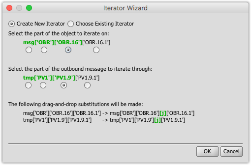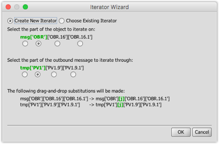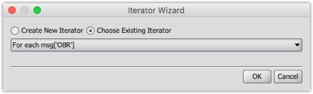 Note that in this case, the variable j was automatically chosen, because the wizard detected that the currently selected step is part of a parent Iterator that is already using the i index variable. We can then choose to iterate through each OBR.16 field instead of on each OBR segment:.
