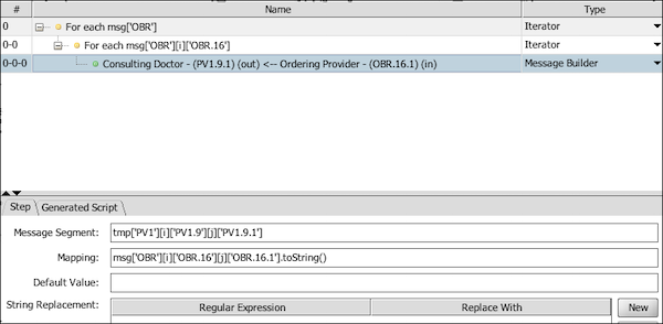 After selecting OK, the step will now be placed inside a new nested Iterator. You can see from the following example that OBR.16.1 is being mapped into PV1.9.1, but now it is being done for each OBR segment, and in turn for each OBR.16 field repetition.