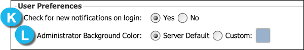 The following image shows the User Preferences section of the Administrator Settings tab, followed by descriptions of the items displayed.