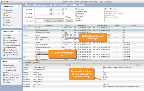 Select the Channels link in the Mirth Connect task panel on the upper-left side of the window. Select a channel where the messages you would like to view reside. Select the View Messages task in the left task list. For additional information, see Channel Tasks. This section is separated into the following topics: Metadata Table Message Content Tab Mappings Tab Errors Tab Attachments Tab Search Messages Message Browser Tasks Parent topic: Navigation