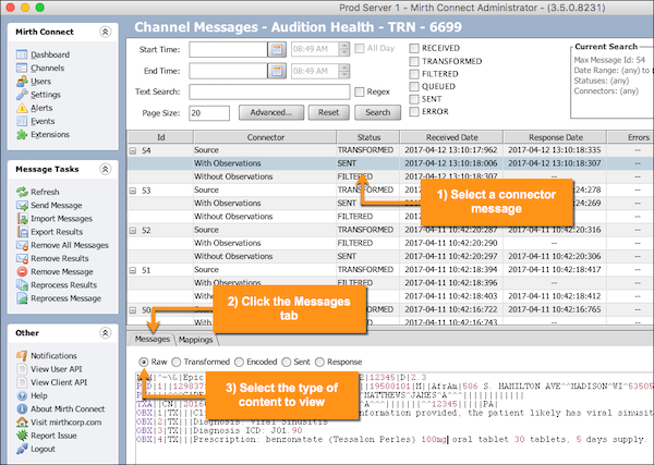 Select the Channels link in the Mirth Connect task panel on the upper-left side of the window. Select a channel where the messages you would like to view reside. Select the View Messages task in the left task list. For additional information, see Channel Tasks. This section is separated into the following topics: Metadata Table Message Content Tab Mappings Tab Errors Tab Attachments Tab Search Messages Message Browser Tasks Parent topic: Navigation