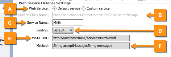 B | Service Class Name | com.mirth.connect.connectors.ws.DefaultAcceptMessage | The fully-qualified class name of the Endpoint service to publish. |