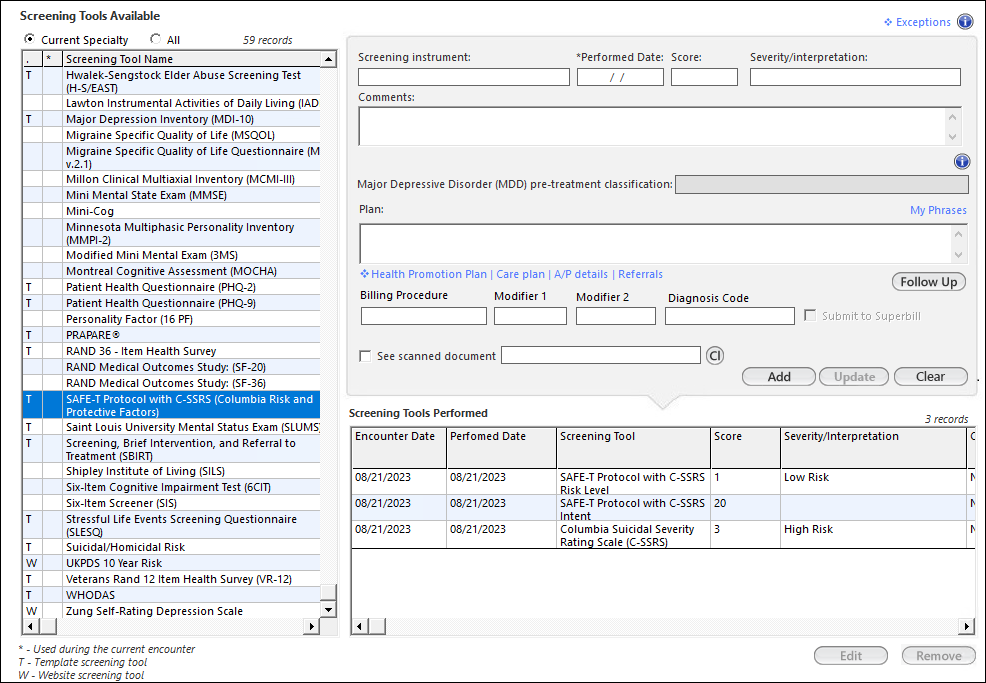 The Columbia Suicide Severity Rating Scale, or C-SSRS, is a suicidal ideation and behavior rating scale that rates an individual's ideation on a scale, ranging from "wish to be dead" to "active suicidal ideation with specific plan and intent and behaviors". Questions are phrased for use in an interview format. But, the C-SSRS assessment questions alone do not meet some regulatory requirements. Another screening tool is introduced that includes the SAFE-T protocol questions along with the C-SSRS questions. As a provider, you can document the suicidal plan and attempt of an individual to assess the risk level. Open the SAFE-T Protocol with C-SSRS Template You can open the Screening Tools template to access the SAFE-T Protocol with C-SSRS template. Document the Risk Factor Details You can identify and document the risk factors of the individual's suicidal ideation. Document the Protective Factor Details You can identify and document protective factors of an individual's living. Document t