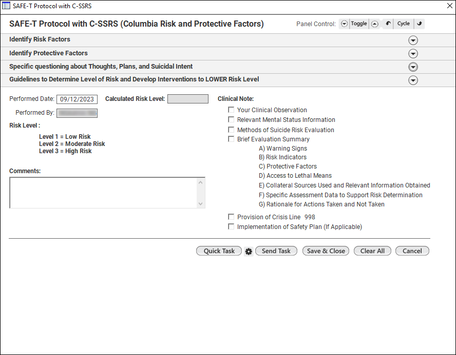 But, the C-SSRS assessment questions alone do not meet some regulatory requirements. Another screening tool is introduced that includes the SAFE-T protocol questions along with the C-SSRS questions. As a provider, you can document the suicidal plan and attempt of an individual to assess the risk level.