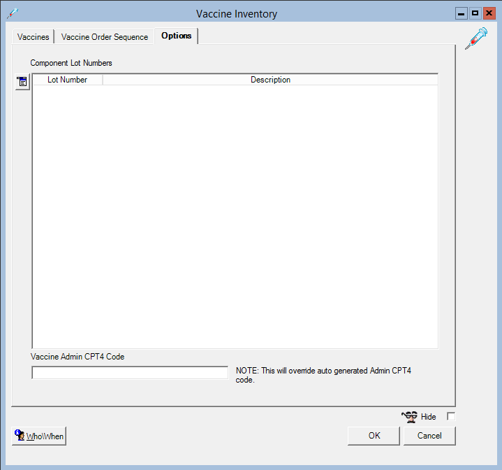 Note: An alternative option for entering Vaccine Admin codes is to add the CPT code to the vaccine inventory entry. This setup works best if you have different lot numbers for doses. Within the inventory entry in the Vaccine Inventory Master File, the Options tab allows for a default Vaccine Admin CPT4 code to be linked, which overrides the system defaults for the Immunization module.