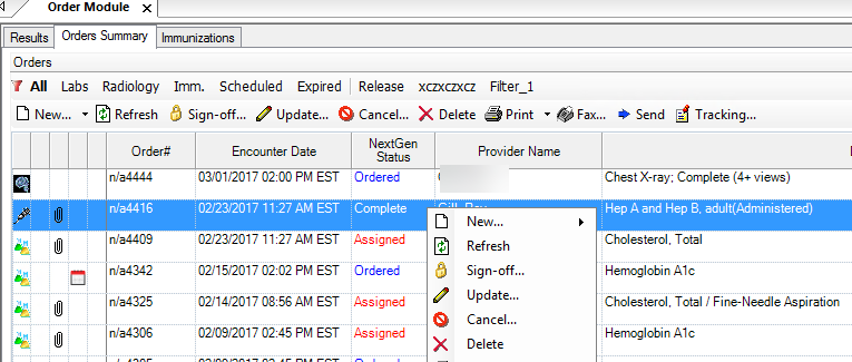 Note: On the Orders Summary tab, any Immunizations order can be deleted, including an Immunizations order with a NextGen Status of Complete.