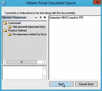 Patient Portal Document Export window opens. You can add comments about the corrected results in the right section of the window.