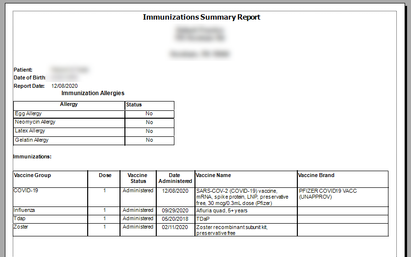 You can print the Immunizations Summary Report from the Orders module. The report displays the details of the administered COVID-19 vaccine which can be printed and submitted to the patient's employer or school.