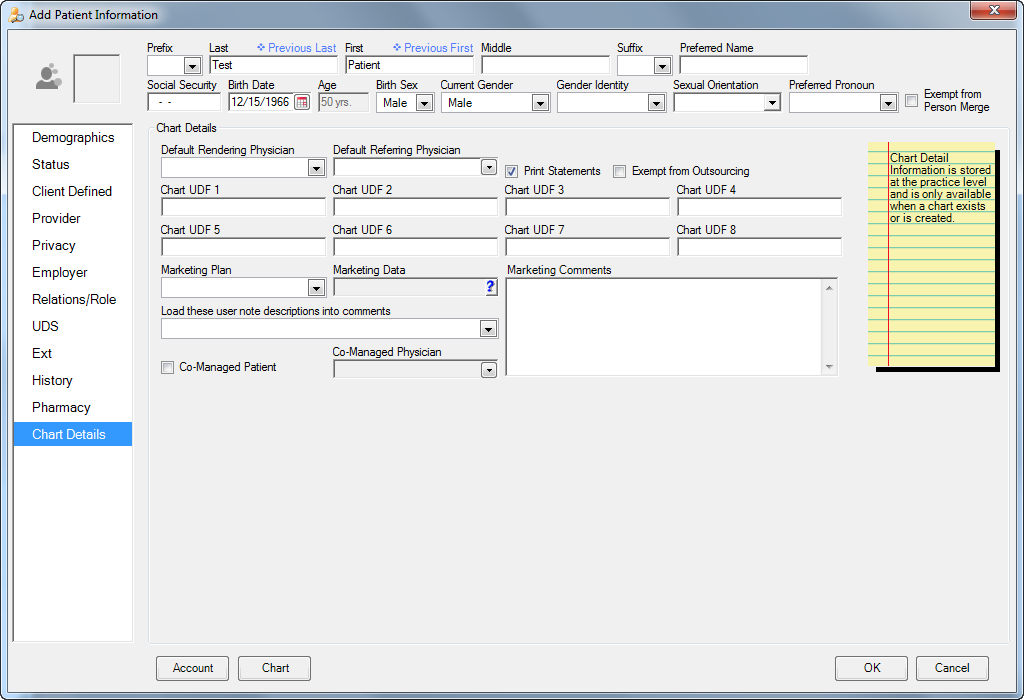 Information on the Chart Details tab is stored at the practice level; therefore, each practice can enter and maintain different information for a patient.