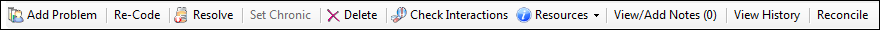 The problem list data entry area toolbar is located at the top of the data entry area and below the data display area. The data entry area toolbar buttons enable you to perform functions related to a patient's problems such as add, recode, and modify the problems.