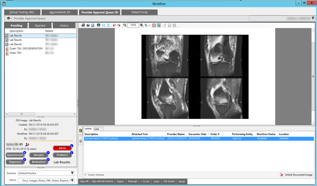 If a NextGen® Document Management image was erroneously linked to an open order in the Orders module, you can unlink it in the Provider Approval Queue tab.