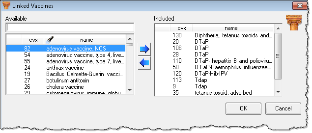 The Linked Vaccines window opens. - Select the appropriate vaccines to add or remove using the arrows buttons.