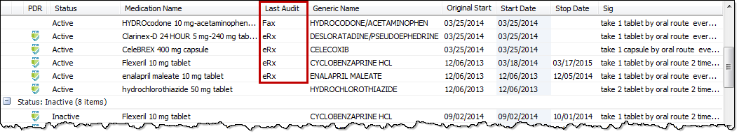 The Medications Module displays the last recorded case of a medication being dispensed (Print/Fax/eRx) in the