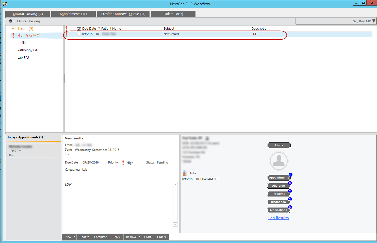 If you select a test order in the Orders module and add result information to it when you save the order, the system displays the test order in the Workflow module in NextGen® Enterprise EHR as a high-priority (!) clinical task. Users can select these tasks to notify the provider (or other appropriate clinical staff) that the results for the test have been received.